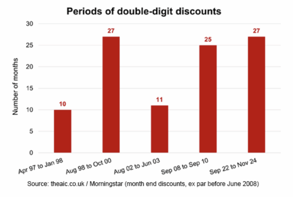 The chart above highlights that the sector average discount at the end of 2024 was -14.8%. According to research from the AIC, investing when the average investment trust discount is more than -10% may lead to significantly better returns over the subsequent five years. The AIC’s analysis of investment trust returns since 2008 shows that when the average discount exceeded -10%, the average investment trust generated a return of 89.3% over the following five years¹.